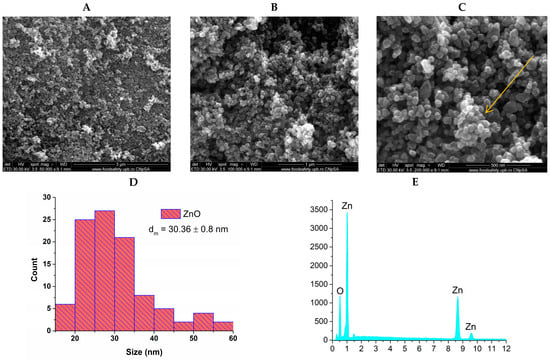 Scanning electron microscopy (SEM) micrographs at (A) 50,000×, (B) 100,000×, and (C) 200,000× magnifications, (D) particle size distribution, and (E) energy dispersive spectroscopy results for ZnO nanoparticles. The SEM micrographs of the ZnO sample, taken at three different magnifications (50,000, 100,000, and 200,000), confirm the formation of quasi-spherical nanoparticles, each exhibiting a consistent individual morphology and size homogeneity. The parameters of the hydrothermal synthesis process were carefully controlled to avoid accelerating the growth of the zinc oxide nanoparticles, resulting in particles with an average size of 30.36 ± 0.8 nm. Although the nanoparticles are small and exhibit a tendency for agglomeration (yellow arrow), they consistently display distinct edges and morphologies. Additionally, the EDS analysis confirms the presence of zinc (Zn) and oxygen (O) in the sample, corroborating previously obtained results.