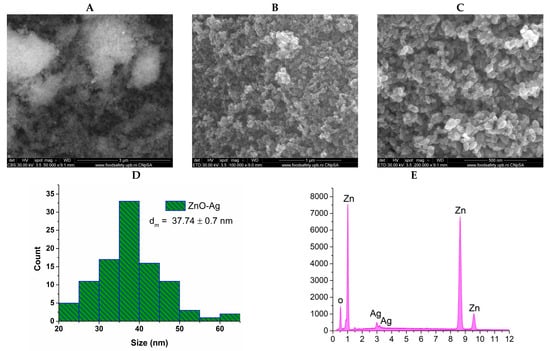 Scanning electron microscopy micrographs at (A) 50,000×, (B) 100,000×, and (C) 200,000× magnifications, (D) particle size distribution, and (E) energy dispersive spectroscopy results for ZnO-Ag nanoparticles.
