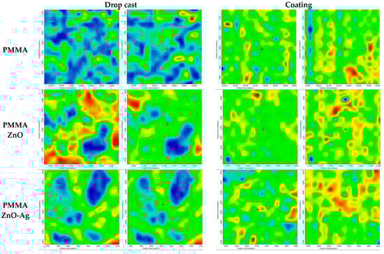 The maps generated from the analysis of all three samples—both the drop cast and PMMA-based coatings containing antimicrobial nanoparticles—exhibit varying colors, which reflect the degree and uniformity of the coatings. In the case of the drop cast samples, extensive blue regions indicate a low level of coverage. In contrast, the spin-coated samples display distinct color differences among the various samples. The PMMA control coating ranges from green to yellow, with several orange-red patches. The sample with ZnO nanoparticles shows notable differences from the control, featuring several red areas. However, the PMMA ZnO-Ag sample demonstrates superior homogeneity in its coating based on the map color, indicating enhanced integrity on the titanium alloy substrate.