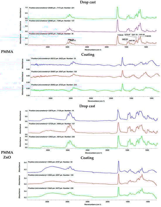 Following the experiment involving the deposition of films based on PMMA enhanced with ZnO and ZnO-Ag nanoparticles, the samples underwent a series of physical and chemical analyses to determine their properties. Given the intended application, the first analysis performed was infrared microscopy, which provided insights into the uniformity of the deposited films and facilitated the identification of the functional groups present in the materials. This information is crucial for assessing the quality of the coated samples. Figure 5, Figure 6 and Figure 7 present the FTIR microscopy results for PMMA, PMMA-ZnO, and PMMA-ZnO-Ag coatings applied to titanium alloys.