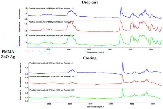 Second derivate IR mappings of PMMA, PMMA ZnO, PMMA ZnO-Ag drop cast and PMMA, PMMA ZnO, and PMMA ZnO-Ag coatings.