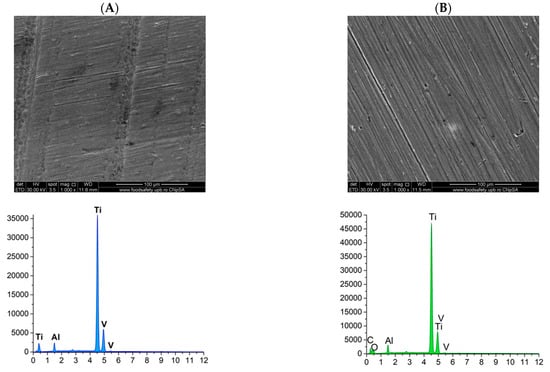 The PMMA-based coatings on the titanium alloy substrate were analyzed using scanning electron microscopy (SEM) to investigate the distribution of the coating on the surface and to identify the elemental composition through energy-dispersive spectroscopy (EDS) (Figure 7).