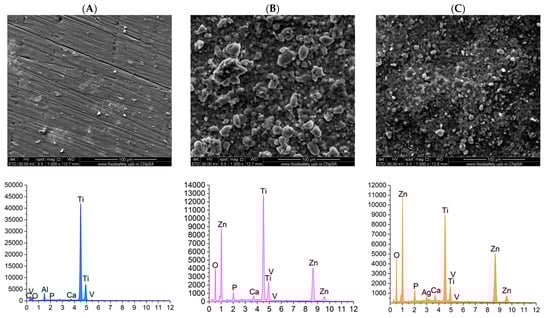 SEM micrographs and EDS spectra for the PMMA coating (A), PMMA ZnO coating (B), and PMMA ZnO-Ag coating (C) after 7 days of SBF immersion.
