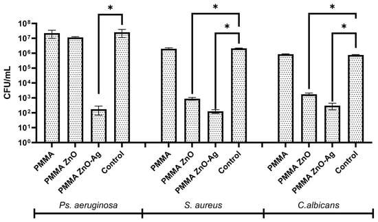 The graphic result for biofilm modulation (log10CFU/mL) of Gram-positive, Gram-negative, and fungal strains after 24 h of incubation with the coating-type samples—PMMA, PMMA ZnO, and PMMA ZnO-Ag; * p ≤ 0.05, one-way Anova (samples versus control).