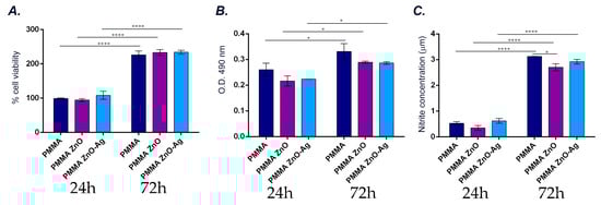 Moreover, assessing the biocompatibility of the coatings, especially the cytotoxicity of ZnO and Ag nanoparticles on surrounding tissues, is vital to ensure patient safety for prospective use in biomedical applications. For this purpose, the impact of PMMA-based coatings on human preosteoblasts was assessed and the in vitro results revealed excellent biocompatibility for all tested samples. This was observed both for PMMA in its unmodified form and for the coatings reinforced with ZnO and ZnO(NanoAg). The materials supported cell viability and proliferation without exhibiting cytotoxic or pro-inflammatory effects, highlighting their potential as promising candidates for biomedical use. The obtained results are consistent with existing literature emphasizing the biocompatibility of PMMA-based material, particularly for applications in bone regeneration and dental implants. PMMA is widely recognized as a versatile and non-cytotoxic material, frequently used in orthopedic and dental applications due to its mechanical stability and ease of processing [,]. The incorporation of functional additives such as ZnO and ZnO(NanoAg) into PMMA matrices has been explored to enhance antimicrobial properties and mechanical performance. A key challenge in incorporating ZnO and ZnO(NanoAg) lies in identifying the optimal concentration of these additives. The goal is to avoid cytotoxic effects while ensuring that the additives effectively deliver their intended biological benefits, such as antimicrobial activity [,,]. The results of this study validate the proposed strategy, as the PMMA/ZnO(NanoAg) coatings exhibited excellent biocompatibility while also mediating antimicrobial effects, demonstrating their suitability for the intended biomedical applications.