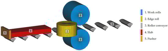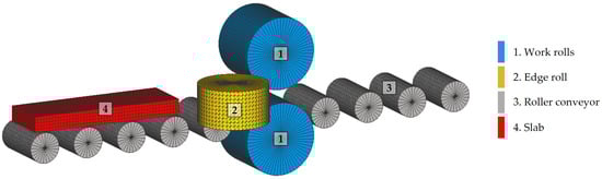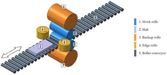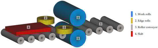 The geometries of the work rolls, edge rolls, roller conveyor, and slab were generated in Blender® 4.1 from the Blender Foundation (Amsterdam, The Netherlands) and exported as STL files, which were subsequently imported into Simufact Forming.