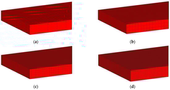 The evolution of the number of element layers in the thickness direction as a function of mesh size: (a) 200 mm mesh size and 1 layer; (b) 65 mm mesh size and 3 layers; (c) 40 mm mesh size and 5 layers; (d) 29 mm mesh size and 7 layers.