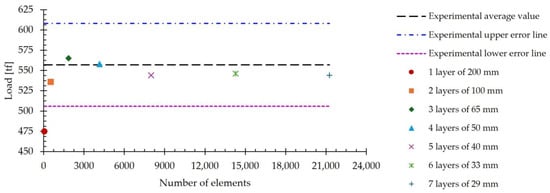 Figure 4 shows the average values of the simulated load, included in Table 6, versus the number of element layers across the slab thickness. According to Table 6, seven cases are represented, in which the number of layers varies from one to seven. As a reference, the experimental average load value of 557 tf is included in this figure. Additionally, the upper and lower error lines derived from the standard deviation of the experimental data, which is 51 tf, are also shown. Convergence is considered to be reached when the value of the load does not vary as the number of elements increases. When analyzing the information included in Figure 4, it is observed that convergence is achieved when five layers of 40 mm finite elements are used. By increasing the number of layers above five and, therefore, by reducing the size of the elements below 40 mm, no significant variations in the estimated value of the load are observed.