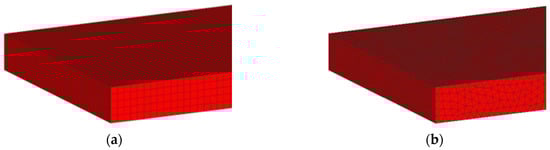 An element type analysis was performed by simulating the first pass of the hot rolling process. For this purpose, a slab mesh composed of eight-node hexahedral elements and another composed of four-node tetrahedral elements were used, Figure 5. An element size of 40 mm was used, which was the optimum value defined in the mesh sensitivity analysis. Thus, the resulting slab mesh consisted of 8000 hexahedral elements, Figure 5a, and 59,700 tetrahedral elements, Figure 5b.