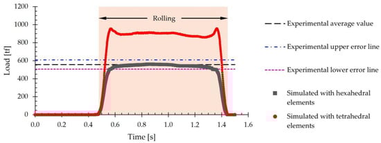 Figure 6 shows that when using tetrahedral elements, the rolling load values fall outside the range defined by the experimental error lines. Specifically, the simulated average value for this type of element is 896 tf. In contrast, when using hexahedral elements, the simulated load values lie within the error range and are close to the experimental average value. For hexahedral elements, the average load value is 544 tf. By comparing the average values obtained by simulation with the experimental value, it is concluded that when using the tetrahedral mesh, the error obtained when estimating the load is 60.9%, whereas when using the hexahedral mesh, the error is only 2.3%.