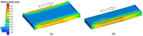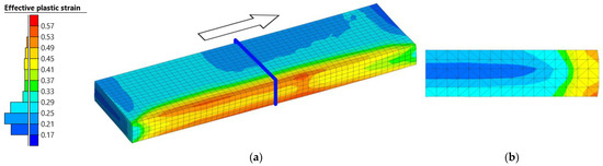 As can be seen in Figure 15a, the distribution of the effective plastic strain is not uniform, with gradients in the longitudinal, transversal, and thickness directions. The highest values are obtained, fundamentally, in the lateral edges of the slab, where maximum values of 0.57 are reached. On the contrary, the lowest values are obtained in the center of the slab, where the effective plastic strain is 0.17.