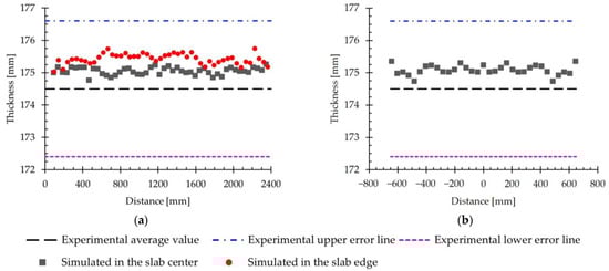 Figure 14a shows an increase in the temperature inside the slab when passing between the work rolls, attributable to the heating generated by the plastic deformation, as described in [14,18]. This thermal increase is less than 1 °C. Outside the rolling zone, the temperature inside the slab remains practically constant.