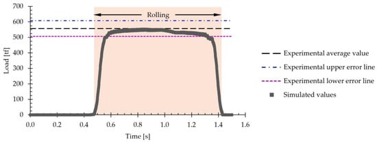 Figure 6 includes the evolution of the simulated rolling load over time using both models. The experimental average load value of 557 tf is included in this figure as a reference. Additionally, the upper and lower error lines derived from the standard deviation of the experimental data, which is 51 tf, are also shown.