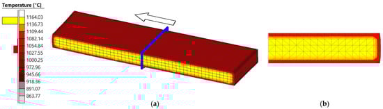Figure 12 shows the values of the temperature distribution in the slab at the end of the first pass. The temperature value could not be used in the validation of the simulations, since only the surface temperature value measured at the end of the seventh pass of the rolling process is available. Figure 12a represents the distribution in half of the slab, while Figure 12b shows its distribution in the cross-section obtained by means of a plane perpendicular to the longitudinal direction.
