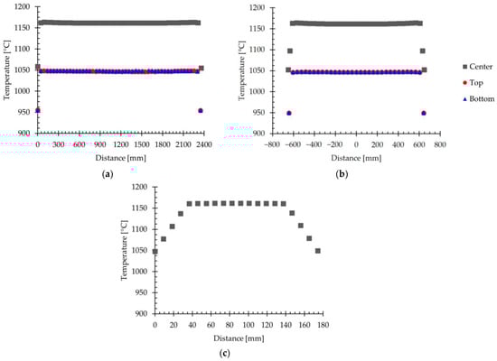 The results presented in Figure 13b for the temperature evolution in the transversal direction show a similar trend. In this figure, the temperature remains approximately constant along the width of the slab in the three regions evaluated, presenting only a decrease in the lateral surfaces of the slab. As in Figure 13a, a clear difference is observed between the temperature values in the center and those of the top and bottom surfaces. Thus, the average temperature in the center is 1162 °C, while values of 1047 °C and 1047 °C are obtained on the top and bottom surfaces, respectively.