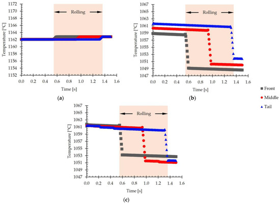 Additionally, the evolution of the temperature with the rolling time was analyzed. Figure 14 shows the evolution of the simulated temperature with time evaluated at the front, middle, and tail of the slab for the center, Figure 14a; the top surface, Figure 14b; and the bottom surface, Figure 14c.