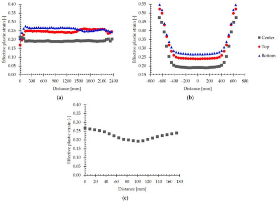 To analyze the variation in the effective plastic strain in greater detail, the evolution of the simulated effective plastic strain in different directions is presented in Figure 16. The evolution in the longitudinal direction is depicted in Figure 16a, in the transversal direction in Figure 16b, and in the thickness direction in Figure 16c. The values represented in these figures were extracted in the center of the slab, as well as on the top and bottom surfaces.