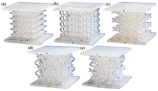 Photographs of the printed lattice structures: (a) Grid; (b) Hexagon; (c) Star; (d) Tetra; (e) Trabecular [25].