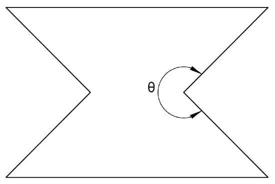 Another lattice structure selected for investigation is the auxetic re-entrant honeycomb. Auxetic materials and structures are characterized by a negative Poisson’s ratio, which describes the response of a solid to uniaxial stress. It is defined as the negative ratio of transverse strain to axial strain. This dimensionless quantity measures a material’s deformation behavior. One of the earliest models of structures with a negative Poisson’s ratio is the re-entrant honeycomb. The term “re-entrant” refers to shapes containing angles greater than θ = 180° directed inward—Figure 3.