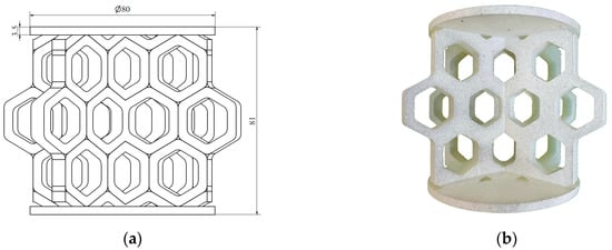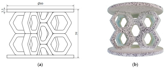 The energy-absorbing tests on lattice structures presented in this article were performed and analyzed using the Digital Image Correlation (DIC) method. In the first stage of the design, a single enlarged unit cell of each topology was created. The schematics and dimensions of the hexagonal and re-entrant honeycomb cells are presented in Figure 4a and Figure 4b, respectively. The dimensions and proportions of the individual cells in each topology are similar. The thickness of the individual cell struts was set at 4 mm so that when the cells were assembled into a structure, the overall thickness would be 8 mm. The thickness of the cell walls, and thus the entire structure, was also set at 8 mm to prevent buckling.