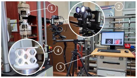 Experimental setup: (1) universal testing machine; (2) two calibrated cameras of the DIC system with lighting; (3) DIC system computer with software; (4) specimen placed on the measurement setup.