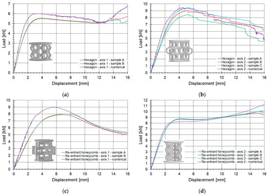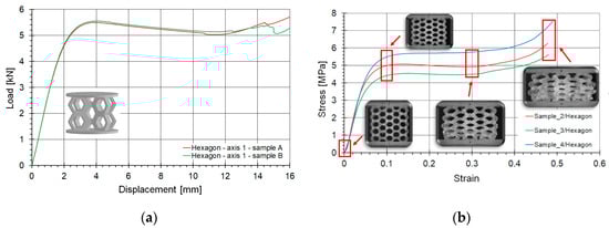Comprehensive compression curve results for all samples of the hexagonal lattice topology loaded along axis 1 are shown in Figure 10a. As can be seen, the curves almost overlap, indicating the repeatability of the tests. These curves were visually compared to the results of the original lattice structure (with non-enlarged cells—Figure 10b) tested in [25]. The shape of the curves is preserved, which positively indicates the accuracy of the topology reproduction.