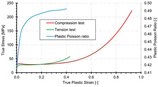 Based on the experimental studies conducted, the SAMP-1 material model was developed and calibrated. The calibration process utilized material curves derived from tensile tests (Figure 11a), compression tests (Figure 11b), and the variation in the Poisson’s ratio observed during tensile testing. The experimentally determined curves were compared with those obtained from the numerical model.