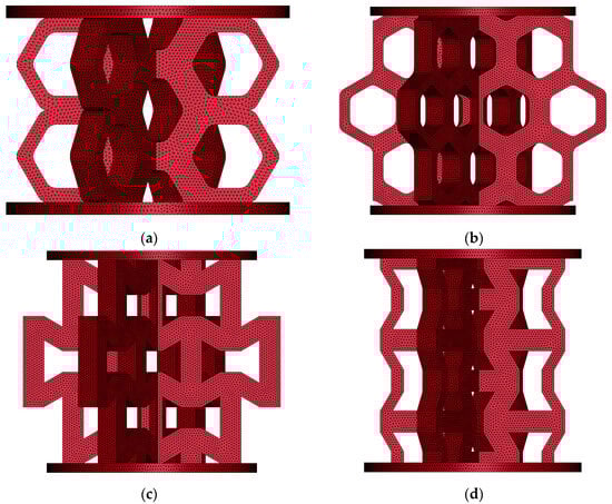 Numerical models of lattice structures: (a) hexagonal topology loaded along axis 1; (b) hexagonal topology loaded along axis 2; (c) re-entrant honeycomb loaded along axis 1; (d) re-entrant honeycomb loaded along axis 2.
