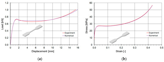 Comparison of the fitting of the tensile material curves determined numerically and experimentally: (a) in force-displacement coordinates, and (b) true stress–true plastic strain domain.