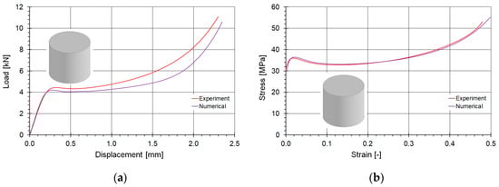 Analogously, Figure 15 shows a comparison of the material compression curves for cylindrical samples. The loading curve fitting can be assessed as good and satisfactory. In this case, the plateau forces are higher in the experiment, whereas, similarly to the tensile tests, the stiffness of the numerical model is identical. The average plateau force value differs by a few percent.