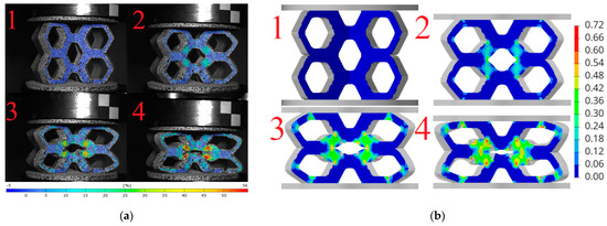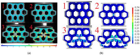 Figure 20b presents an analogous series of four images of numerical calculation. The strain concentrations in the simulation were located in the same regions as in the experiment, specifically on the internal diagonal struts of the cells. During compression, the model did not buckle and behaved similarly to the 3D-printed structure.