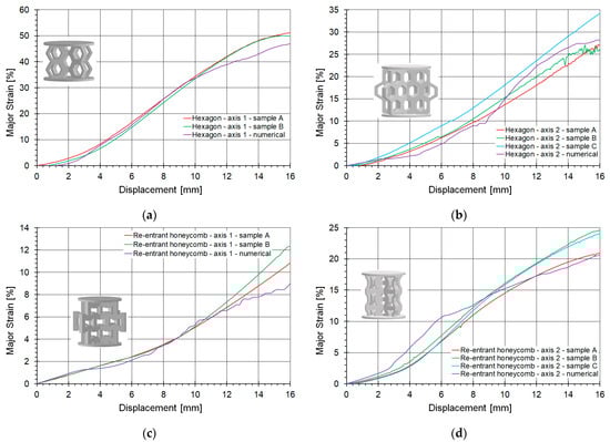 The re-entrant honeycomb topologies also performed well (Figure 23c). The numerical model accurately captured the behavior of this structure when compressed along axis 1. Compression along axis 2 in the numerical simulation produced a slightly undulating curve. The initial segments of the curves were well simulated for all topologies. The differences in average major strains did not exceed 10% (Table 3).