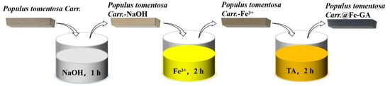 Populus tomentosa Carr. (dimensions 50 mm × 50 mm × 2 mm) was soaked in a 10% NaOH solution for 1 h, effectively removing lignin and some hemicellulose, thereby exposing more hydrophilic cellulose groups and enhancing the material’s water absorption [49]. After washing with distilled water until neutral, the wood was dried in a vacuum oven at a temperature of 60 °C. To further improve material photothermal properties, the dried Populus tomentosa Carr. was impregnated in various concentrations of an FeCl3 aqueous solution (0%, 2%, 4%, 6%, 8%) for 1 h and subsequently dried in a vacuum oven at a temperature of 60 °C. It was then immersed in various concentrations of a TA aqueous solution (0%, 2%, 4%, 6%, 8%) for 1 h. The resulting blackened wood chips were rinsed with deionized water until the solution was clear, yielding Populus tomentosa Carr.@Fe-GA. The samples were labeled as Populus tomentosa Carr.@Fe-GA-X (where X represented the different impregnation concentrations × 100). Figure 1 illustrates the preparation of the Populus tomentosa Carr.@Fe-GA photothermal material. The reaction followed the chemical reaction in Equation (1).