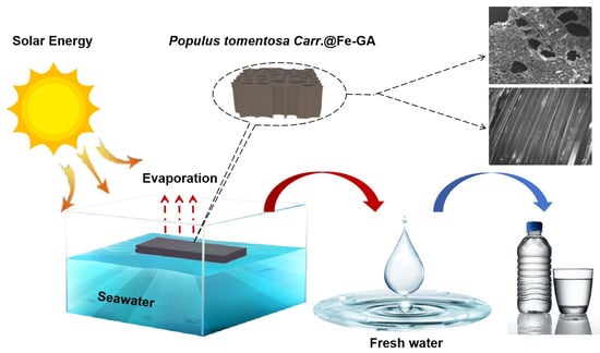 This work used cross-sectioned Populus tomantosa Carr. as the substrate material, utilizing the wood’s natural hydrophilic moisture transport channels for natural moisture transport, and set up simulated seawater desalination apparatus. A schematic diagram of the Populus tomentosa Carr.@Fe-GA evaporation system is shown in Figure 2.