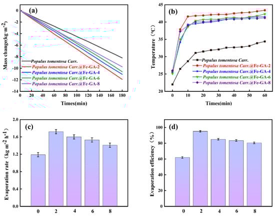 The temperature rise curve (Figure 3b) also confirms the above results; the temperature rise rate of Populus tomentosa Carr.@Fe-GA-2 was faster than that of Populus tomentosa Carr. and Populus tomentosa Carr.@Fe-GA-(4, 6, 8), and the surface temperature of Populus tomentosa Carr.@Fe-GA-2 could reach up to 43.4 °C after 60 min, indicating its excellent moisture evaporation performance. Additionally, the outstanding photothermal conversion efficiency of Populus tomentosa Carr.@Fe-GA is attributed to several factors: (1) The tannin–iron complex created during the reaction had a strong ability to absorb solar light and quickly transformed solar energy into thermal energy. (2) The vertically arranged channel structure within the wood effectively reduced the resistance to water transport. (3) The insulating properties of the wood minimized heat loss to the water body. This work will focus on Populus tomentosa Carr.@Fe-GA-2, which is assumed to be Populus tomentosa Carr.@Fe-GA.