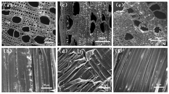 SEM images of (a,b) Populus tomentosa Carr.; (c,d) P@NaOH; and (e,f) P@Fe-GA (Populus tomentosa Carr. is abbreviated to P).