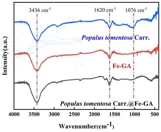 To reveal the mechanism of Populus tomentosa Carr. blackening, comparative experiments and analytical characterization were conducted. Energy spectrum analysis showed that compared to Populus tomentosa Carr., the O element content in Populus tomentosa Carr.@Fe-GA increased (Table 1), and the characteristic peak of the benzene ring was detected in the 1620 cm−1 region (Figure 5), indicating that TA was successfully loaded onto Populus tomentosa Carr. Meanwhile, Fe is detected in Populus tomentosa Carr.@Fe-GA, indicating the interaction between TA and Fe3+ and the formation of coordination compounds.