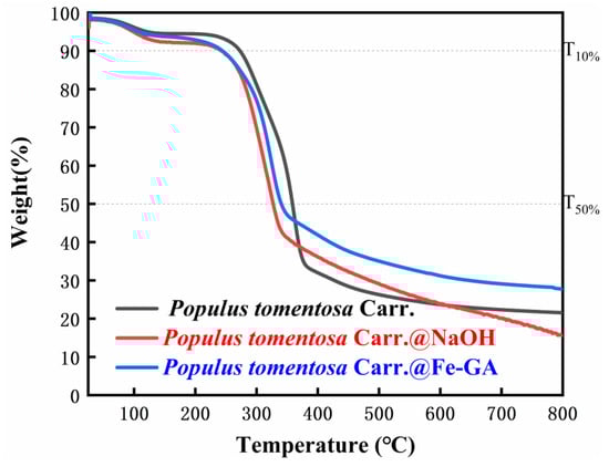 TG curves of Populus tomentosa Carr., P@NaOH, and P@Fe-GA (Populus tomentosa Carr. is abbreviated to P).