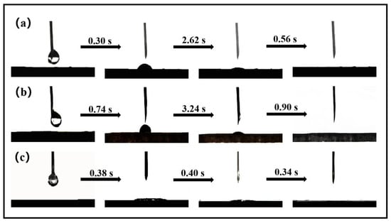 Wettability performance test of (a) Populus tomentosa Carr.; (b) P@NaOH; and (c) P@Fe-GA (Populus tomentosa Carr. is abbreviated to P).