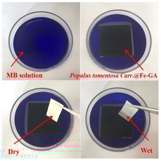 As shown in Figure 8, the bottom of Populus tomontosa Carr.@Fe-GA was immersed in a methylene blue aqueous solution. When the absorbent paper came into contact with the upper surface of Populus tomontosa Carr.@Fe-GA, it could quickly extract the methylene blue solution vertically from the bottom through the water transport channel of the wood itself. At the same time, the extracted solution was mostly water-soluble, indicating that Populus tomontosa Carr.@Fe-GA has excellent adsorption and hydrophilicity. Its vertical water transport channel helped to transport water upward, providing sufficient water for the continuous output of wood-based photothermal materials. In addition, it also proves that Populus tomontosa Carr.@Fe-GA prepared in this paper had excellent firmness.