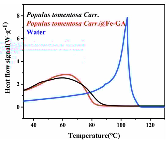 DSC curve of Populus tomentosa Carr., Populus tomentosa Carr.@Fe-GA, and water. (Populus tomentosa Carr. is abbreviated to P).