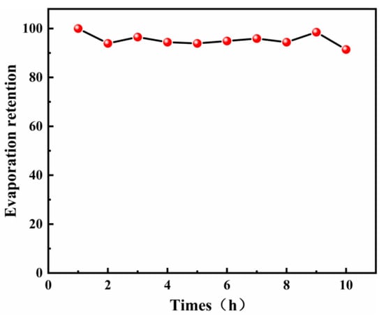 After 720 h of continuous rinsing, the moisture evaporation rate retention rate of Populus tomentosa Carr.@Fe-GA was tested over 10 cycles (Figure 12). It can be noted that the rate of moisture evaporation for Populus tomentosa Carr.@Fe-GA remained very stable after 720 h of rinsing, with an average moisture evaporation retention rate of 95.4%, indicating that Populus tomentosa Carr.@Fe-GA prepared in this study exhibited excellent sustainability.