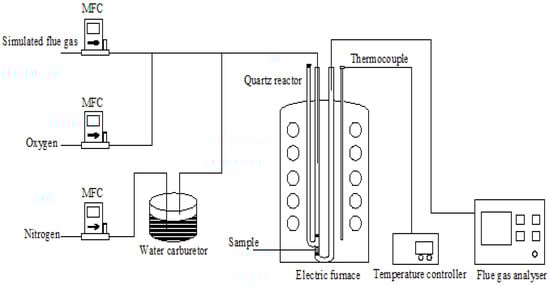 The desulfurization tests of flue gas using the FZC were conducted in a fixed-bed quartz reactor with a 10 mm inner diameter, heated in an electric furnace. Mass flow controls delivered the simulated flue gas into the reactor, while steam was supplied through a water bath. The steam content was regulated by modifying the temperature of the water bath. An online gas analyzer (MRU-5) was employed to assess the concentration of SO2 in the exhaust gas. N2 served as the balancing gas in the trials. The desulfurization studies were conducted at a volumetric hourly space velocity (VHSV) of 1500 h−1 and within a temperature range of 100 to 300 °C. Approximately 1.3 g (2.4 mL) of sorbent was positioned at the center of the reactor. Before each test, the sorbent-containing reactor was heated to the specified temperature under nitrogen to remove air from the reaction environment. The constituents of the simulated gases and experimental circumstances are detailed in Table 2. Figure 1 illustrates the schematic diagram of the experimental setup.