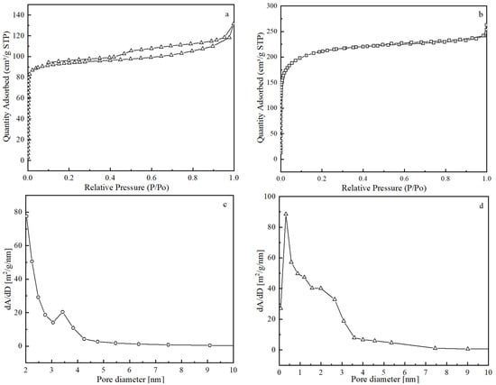 (a) Lignite char adsorption isotherms; (b) FZC adsorption isotherms; (c) lignite char pore size distribution curves; (d) FZC pore size distribution curves.