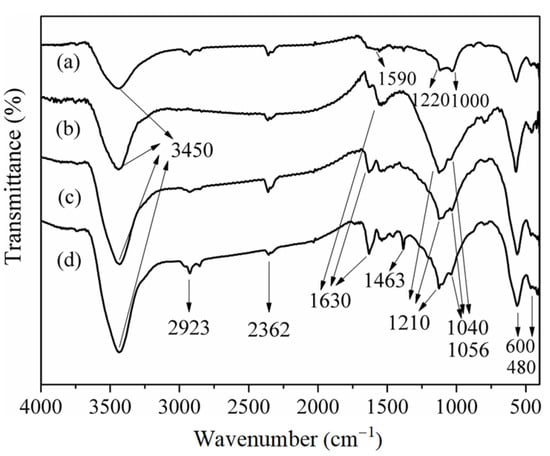 A broad, strong peak at about 3450 cm−1, indicative of O–H stretching vibrations from hydroxyl groups and physically adsorbed water, was detected in all samples [32]. The band at 2923 cm−1 was ascribed to the υ(C–H) stretching vibration of methylene groups [33,34]. The band at 2362 cm−1 corresponds to the υ(C≡C) vibration in the alkyne functional group. Significant alterations in the IR spectra before and after desulfurization were noted in the 1700–400 cm−1 range. In the fresh sorbent (Figure 4a), the bands at 1220 and 1100 cm−1 are attributed to the C–O in ethers, while the band at 1590 cm−1 is associated with C=O (carboxyl-carbonates). The oxygen functional groups on the sorbent serve as active sites for the adsorption of SO2 and function as catalysts for the reaction between metal oxides and sulfur dioxide. The bands between 600 and 480 cm−1 were attributed to the adsorption of metal oxides [35,36,37] involved in the desulfurization reactions. In the deactivated sorbent in various experimental settings (b, c, and d in Figure 4), the band at 1056 cm−1 is attributed to the symmetric stretching vibration of –SO3 [38]. This band’s existence verifies the chemical adsorption of SO2 during the desulfurization process. The bands at 1210 and 1040 cm−1 were attributed to the adsorption of SO42− [39]. The bands at 600 and 480 cm−1 correspond to metal sulfates and sulfides formed during sulfur dioxide adsorption [40,41]. The examination of the IR spectra of both fresh and sulfidated sorbents revealed that the oxygen functional groups and metal oxides served as the active sites on the sorbent [42]. The data also validated the creation of H2SO4, metal sulfides, and metal sulfates during desulfurization [43].