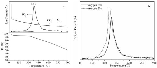 To better understand the mechanism of SO2 oxidation–adsorption, the sulfidated FZC sorbents were subjected to heat treatment by using TG-MS analysis. Figure 7a shows the weight loss and gas evolution curves during the thermal decomposition of the sulfidated sorbent at 100 °C. A slight weight loss was observed at around 50–150 °C and was attributed to moisture loss from the sulfidated sorbent. The primary weight loss was detected in a temperature range of 250–900 °C, corresponding to the evolution of SO2, the decomposition of sulfur species, and the evolution of CO2. The primary weight loss in the sorbent was attributed to the evolution of SO2, formed due to the decomposition of sulfur species produced during desulfurization. The evolution of SO2 from the sorbent started at around 250 °C and reached its maximum at 375 °C. Similar results have been reported in the literature [46,47,48,49]. No SO2 evolution was observed at temperatures higher than 600 °C. The decomposition of sulfur species and evolution of SO2 can be summarized in the following equations: