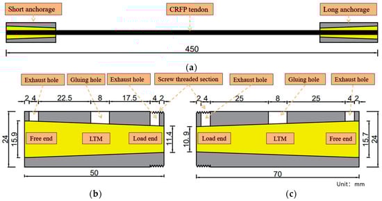 Specimen: (a) overall schematic diagram; (b) anchorage A; (c) anchorage B.