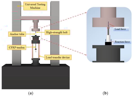 For textured CFRP anchorages, when the surface compressive stress reaches 100 MPa, the ultimate strength of the CFRP anchorage is achieved [31]. The anchorage zone in this experiment employed conical anchor pipes. Due to the small angle, the surface compressive stress can be approximated using a straight anchor tube calculation. A load of 22 was applied to the free end of anchorage A through high-strength bolts, resulting in an average radial compressive stress of 100 MPa. To induce failure at the short anchorage end, a load of 28 was applied to the free end of anchorage B. The preload was applied using displacement control at 4 , as shown in Figure 4.