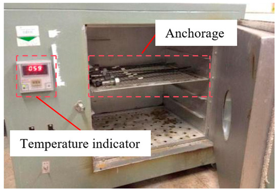 The experiment was conducted in two phases. First, the assembled specimen was placed in an oven for accelerated aging at a controlled temperature, as shown in Figure 5. After the accelerated aging test, a tensile test on the anchorage was performed using a universal testing machine (as shown in Figure 6) to measure the maximum and residual bonding strengths.