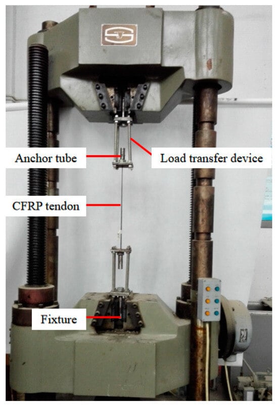 Carbon-fiber-reinforced polymers (CFRPs) are characterized by their light weight, high strength, and excellent corrosion resistance, significantly addressing issues associated with traditional steel cables, such as their susceptibility to corrosion and poor fatigue performance [1,2,3]. Compared to their traditional steel rebars, CFRP cables offer the following advantages: (1) CFRPs exhibit strong corrosion resistance, with negligible performance degradation under acidic, alkaline, saline, and freeze–thaw conditions [4,5,6]. (2) The tensile strength of CFRP cables exceeds that of steel cables, meeting the load requirements for ultra-long cables. However, due to CFRP cables’ significant anisotropy (i.e., the transverse tensile strength is less than 10% of the longitudinal tensile strength), optimizing these advantages largely depends on the cable’s anchorage system [7,8]. Currently, the main types of CFRP anchorage devices include bonded anchorages [9,10], mechanical anchorages [11], and hybrid anchorages [12,13]. Hybrid anchorages combine the benefits of both mechanical and bonded anchorages, although their assembly process is relatively complex. Compared to mechanical anchorage systems, bonded anchorage systems are better suited for CFRP cables and offer wider application potential in cable structures.